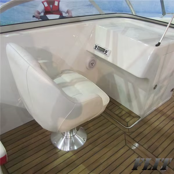 1.Fiberglass hull and deck structure, deck hull white gelcoat,down hull gelcoat in black or black red, or red white, or blue–1 set 2.Basic SS316 Hardware for whole boat–1 set 3.Navigation Light, Stern Left Light and Right Light–1 set 4.12V 25W Cabin light–4 pcs 5.Auti-Static Plastic Fuel Tank 70L (With Fuel Filler Pipe and Fuel Level)–1 set 6.PVC wear-resisting teak-looking full flooring–1 set 7.12V bilge pump + float switch–1pc 8.Fengfan 12V 200AH Battery–1 pc 9.Stainless Steel bow deck rail–1 set 10.Aluminum-alloy windshield with glass screen–1 set 11.Stainless steel front deck railing (Bumpers/Fenders)–1 set 12.Anti-collision balls–4 pcs 13.Rotatable,height-adjustable genuine leather driving chair and Rotatable first officer’s seat–1 set 14.Bow and Stern seats with leather cushion, Cotten Fabric Bed–1 set 15.Multifunctional Aluminum Supporter Height Adjustable HDPE or Wood Table–1 set 16.SS316 Telescopic and foldable Boarding Ladder–1set 17.Handle Style Carbon Steel Anchor (20m rope +Anchor)–1 set 18.Functionality waterproof MP3 player(with Radio,Bluetooth,USB Function) and 4 pcs speakers on the boat (waterproof cabin speakers 2pcs;flying bridge speakers 2pcs) 19.Stainless steel ski pole–1 pc 20.Hidden Glittering Cup-holder–2 pcs 21.Shipping cradle(Iron support for container)–1 set 22.Life Jacket—5pcs